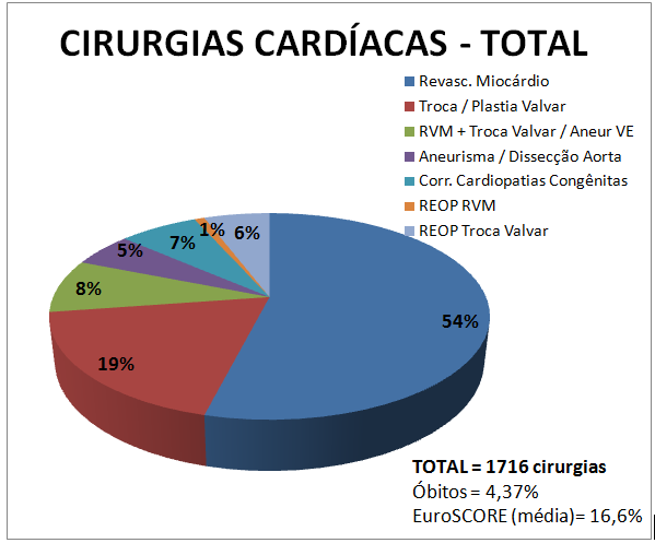 Nos últimos 10 anos, foram realizadas 1716 cirurgias. Do total, 54% eram de ponte de safena, 19% de troca de válvula e o restante, cirurgias mais complexas, como cirurgias combinadas, de aneurisma/dissecção de aorta, reoperações e de cardiopatias congênitas.