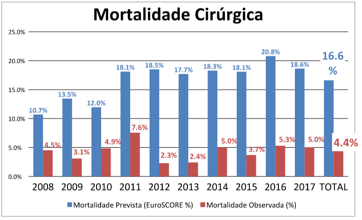 “Tivemos média de 4,3% de óbitos (de cada 100 operados morreram menos que cinco pacientes, todos graves), enquanto o EuroSCORE é de 16,6%”, explica o cirurgião cardiovascular do hospital, Alexandre Zilli,. A mortalidade cirúrgica média nacional é de 7% e nos EUA (Society Thoracic Surgeons) de cerca de 4%. EuroSCORE é o sistema europeu de avaliação de risco em cirurgia cardíaca (European System for Cardiac Operative Risk Evaluation – EuroSCORE), desenvolvido em 128 centros países europeus e destina-se a prever mortalidade em 30 dias nos pacientes submetidos à cirurgia cardíaca.